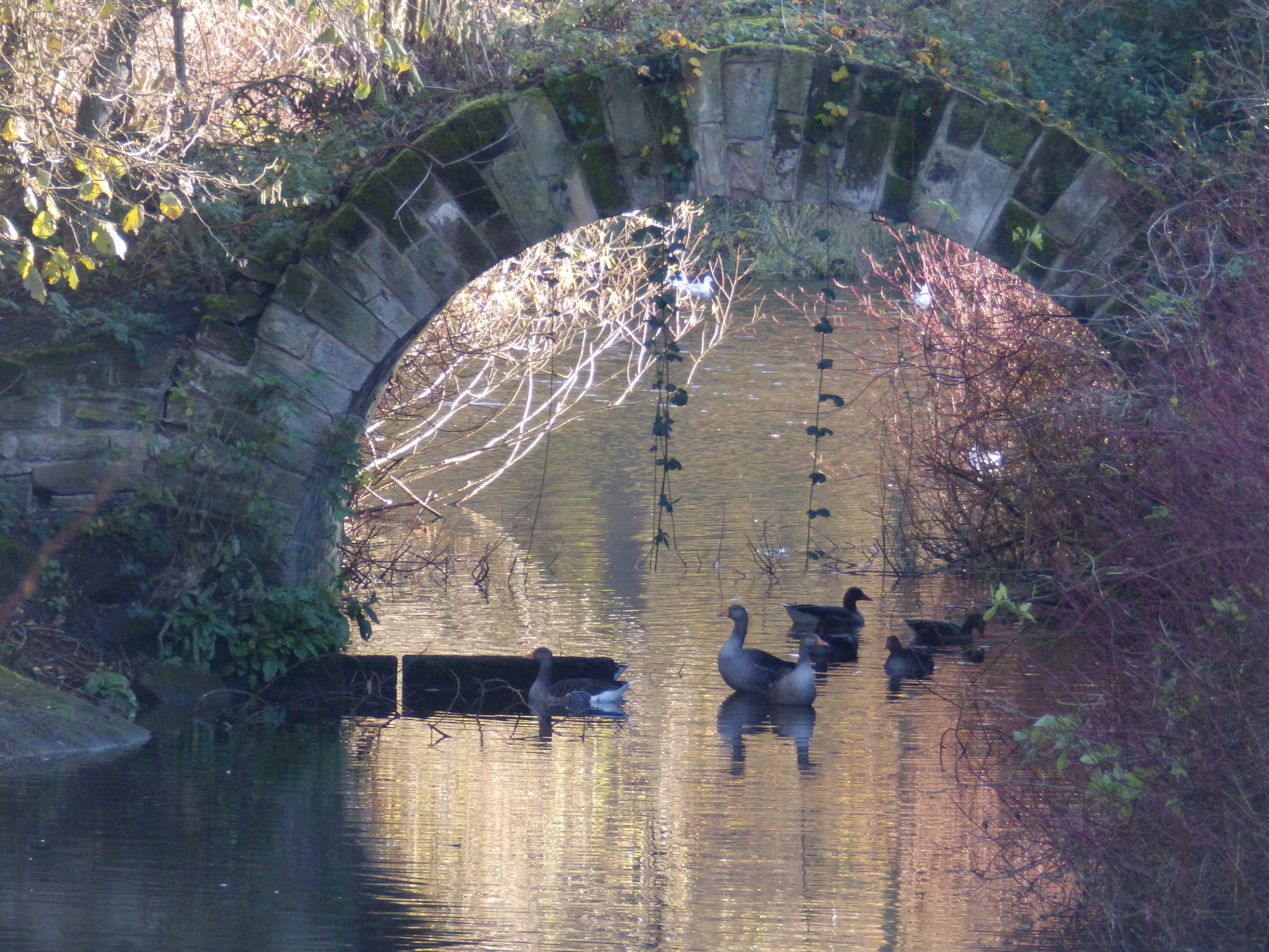 Greylag geese under archway at Rufford