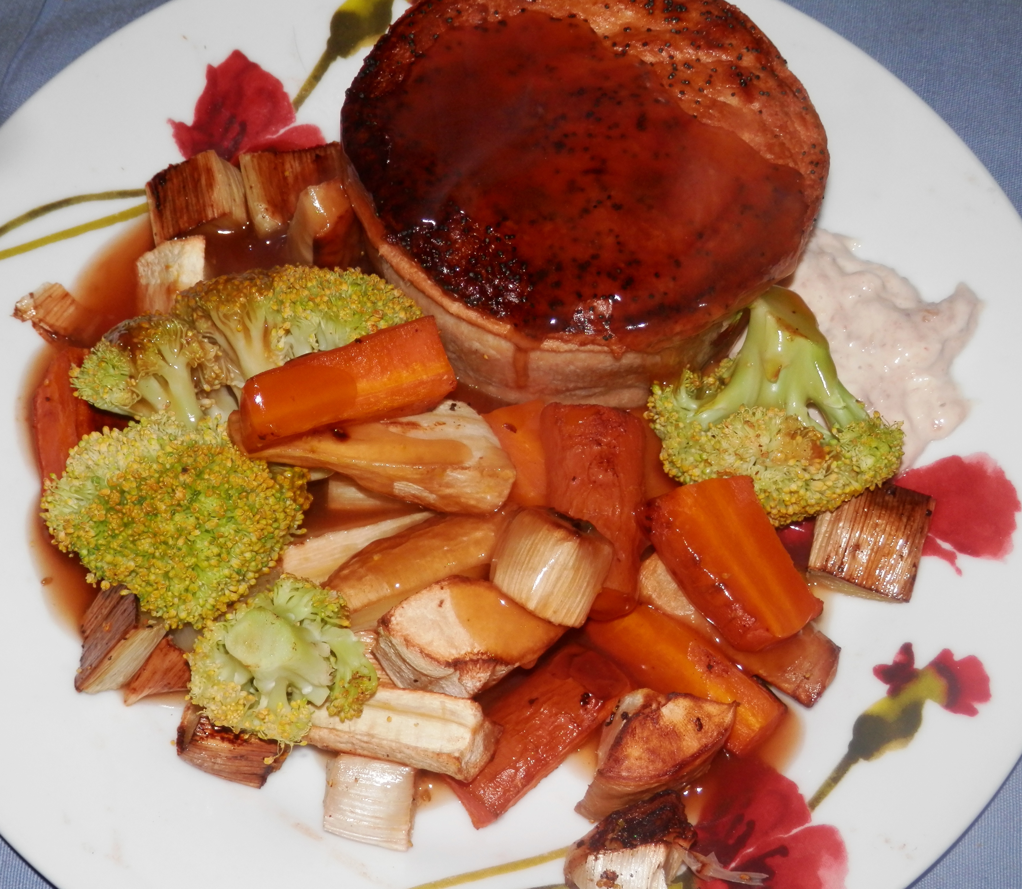 Pie, gravy and roasted veg